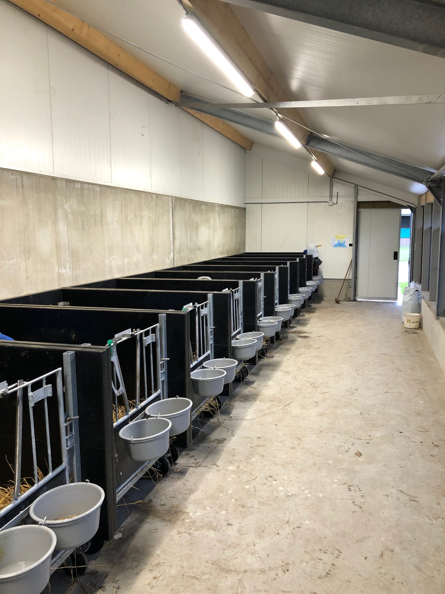 Die Kunststoffwände des Kälberboxen auf Rädern sind vollständig geschlossen, sodass keine Abschluss- oder Begrenzungsprofile erforderlich sind, hinter denen möglicherweise Fliegenlarven oder anderes Ungeziefer kriechen können. Darüber hinaus sind diese Boxen sehr leicht zu reinigen. Die Boxen haben einen niedrigen Eintrag für Kalb und Landwirt, nämlich ca 20 cm. Die Boxen sind mit einem Kunststoff Bodenplatte ausgestattet, damit das Kalb mehr Halt hat. Die Unterseite des Gitters kann auch leicht gereinigt werden, indem das Gitter diagonal gegen die Rückwand gelegt wird. Das Vordertor bietet eine Verriegelungsmöglichkeit für die Wade. Der Kälberbox steht auf 4 schwenkbaren Rädern, wodurch die Box sehr leicht zu bewegen und auf einer kleinen Fläche leicht zu handhaben ist. Die vorderen 2 Lenkräder sind gebremst. Zusätzlich kann das Vordertor 20 cm zurück zwischen den Seitenwänden platziert werden, was mehr Schutz für das Kalb bietet.