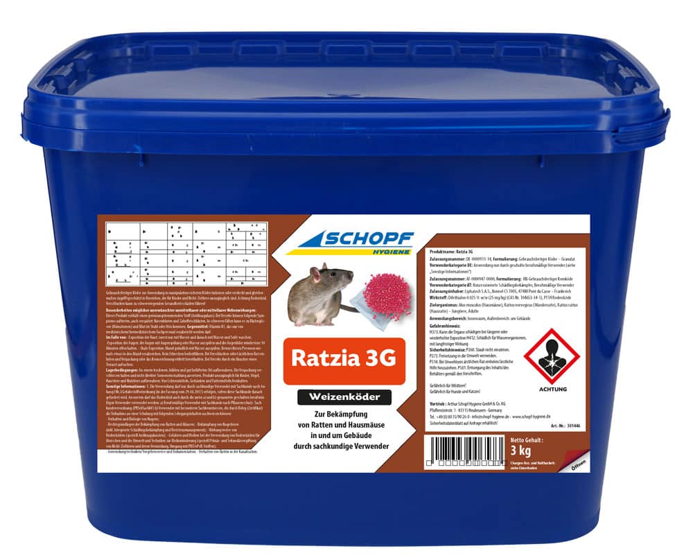 Ratzia Weizenköder ist ein Fertigprodukt zur Bekämpfung von Mäusen und Ratten im Haus, im Stall und auf Mülldeponien. Sichere und schmerzlose Bekämpfung. Sehr attraktiver Köder für Mäuse.