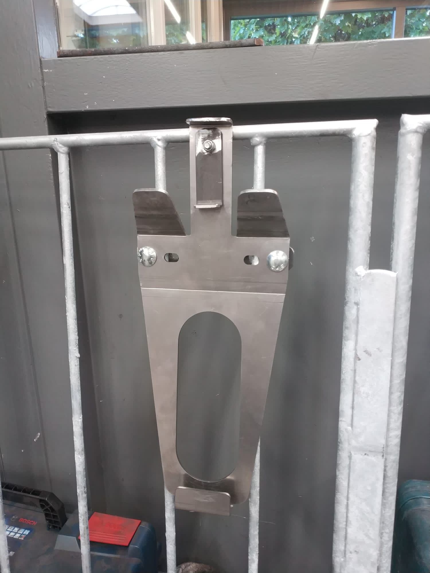 Galvanized teat bucket holder, suitable for DairyTop calf pens. Holders above and below the bucket prevent the calf from knocking it off.
