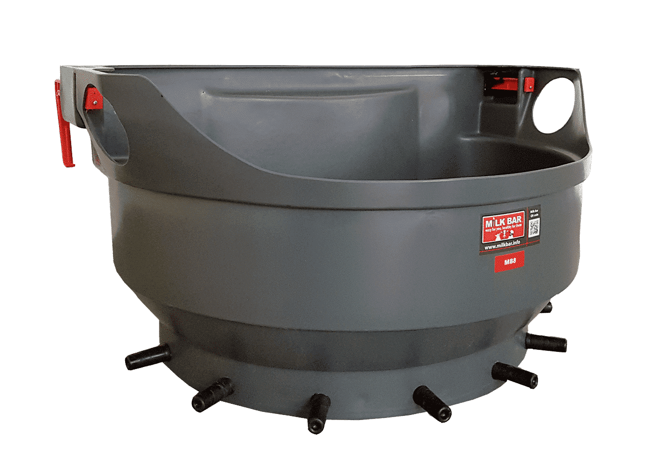 De ideale drinkbak voor groepen tot en met 10 kalveren. De Milkbar MB69B heeft een inhoud van 60 Liter.De verstelbare bevestigingshaken zijn ideaal voor een snelle, stevige bevestiging. Dankzij deze haken kan de Milkbar MB22 ook omgedraaid over het voorhek hangen. Dit vermindert de speen slijtage aanzienlijk. De nippels hoeven niet te worden verwijderd om te worden schoongemaakt; gewoon “melken” met water. De drinkbakken zijn gemakkelijk te dragen omdat ze in elkaar passen.